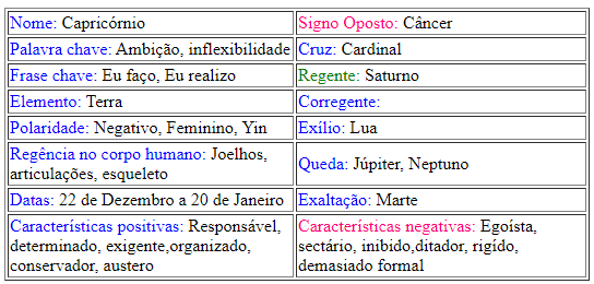 Capricórnio é o símbolo da estrutura bem organizada e estabilidade. Os capricornianos gostam de ter a vida bem organizada e estruturada, são muito determinados mas não dados à aventura e á mudança, muitas vezes são bastante resistentes à mudança e à inovação. São homens e mulheres de iniciativa firme fixa e determinada, são bons líderes não se desviando da sua linha de ação. Trabalham com paciência e preserverança para levarem a cabos as suas tarefas e cumprirem os seus objetivos. Podem ser workahloics, pondo sempre À frente de tudo o trabalho. Gostam de estruturas bem definidas e hierarquizadas pelo que são ótimos na vida militar. Fidelidade, disciplina e sentido do dever são algumas das suas características principais.