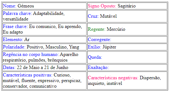 Os Geminianos são seres do elemento Ar, logo intelectuais e analíticos por excelência, são extremamente versatéis e conseguem gerir várias situações ao mesmo tempo. São sempre curiosos a descobrir novas realidades ou a desvendar mistérios. São comunicadores natos, como o seu regente Mercúrio. Têm um profundo respeito e curiosidade pelo sagrado e pelo facto de não ser possível racionalizá-lo à vista da lógica cartesiana. São também ótimos negociadores e comerciantes.